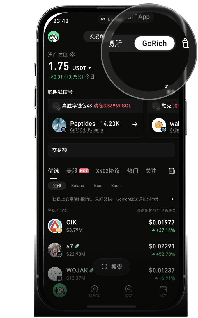 GoRich 聪明钱提供全网最全面的 KOL(关键意见领袖)名单,实时监控其买卖行为,提供精准交易信号,助您抢占市场先机。通过“一键下单”,可轻松跟随 KOL 动态执行交易策略。